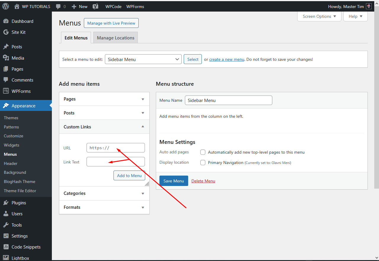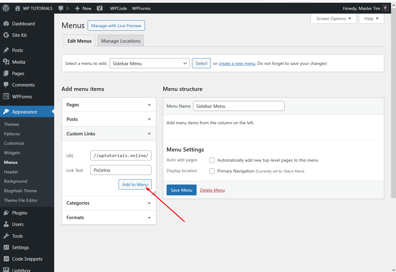 Uloguj se na Admin Panel i klikni na Appearance pa na Menus.