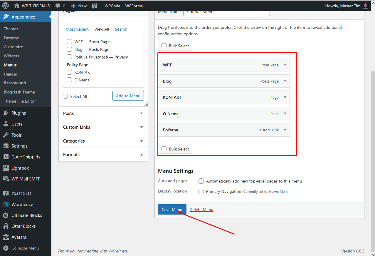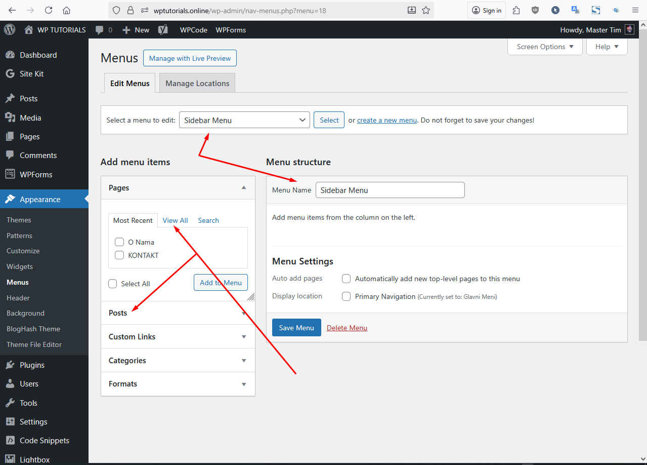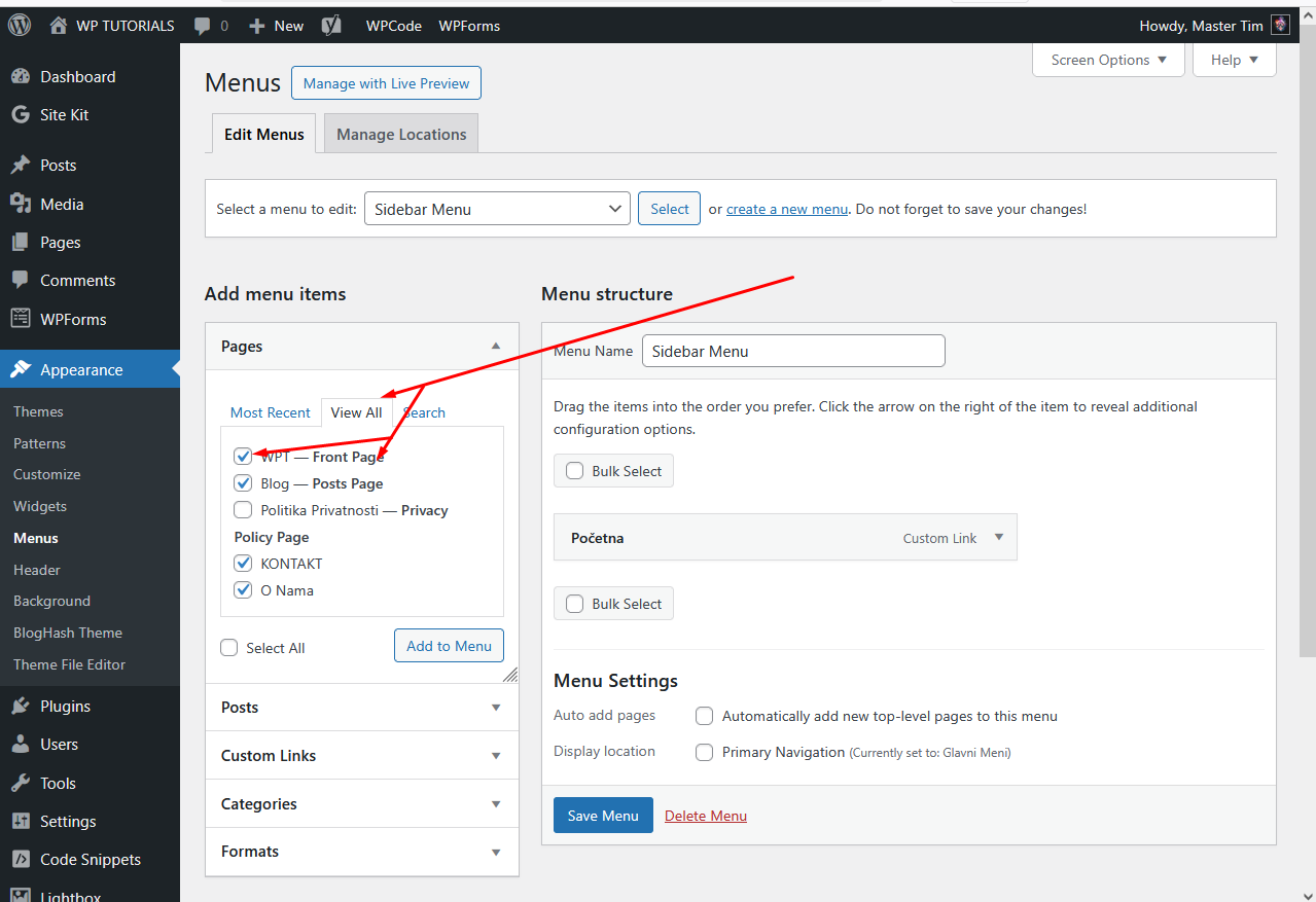 Nazvaćemo ga Sidebar Menu kao na slici ispod,strelice pokazuju šta sve možemo ubaciti ( Pages,Posts,CustomLinks itd…). Obavezno klikni na View All kako bi bile prikazane sve stavke.