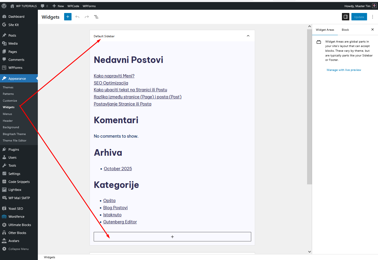 Zatim na Default Sidebar klikni na plus.