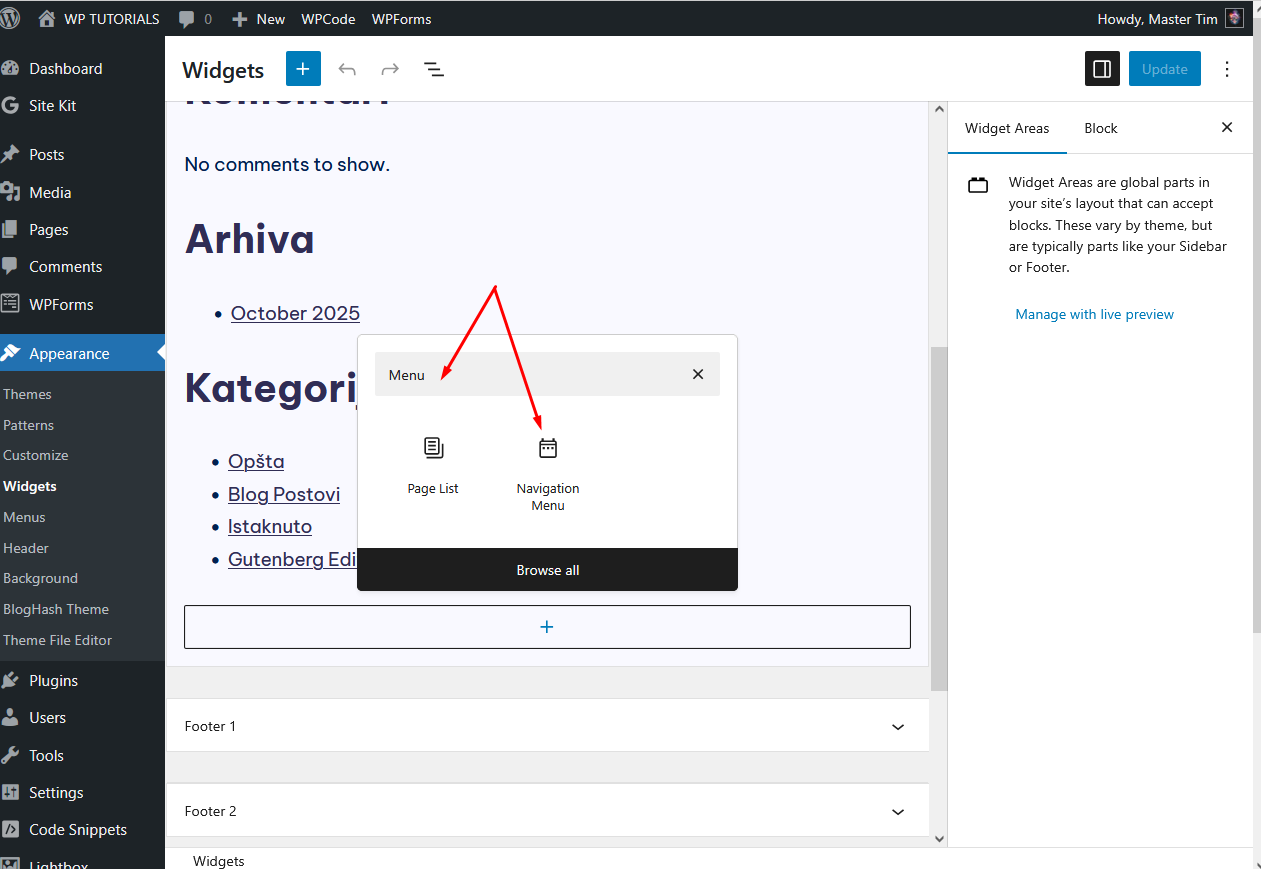 Klikni na Appearance pa na Widgets,otvoriće se panel Sidebar,Footer…