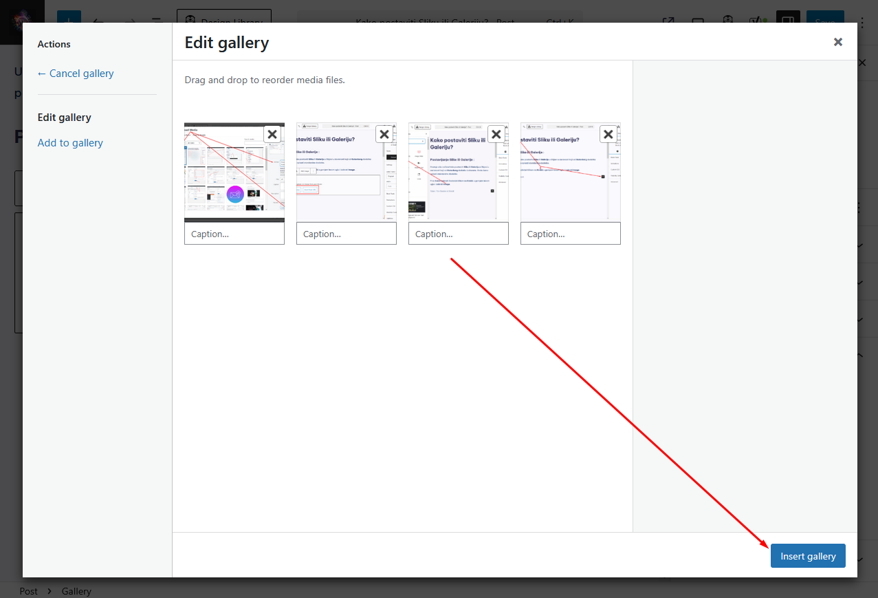 Princip je isti samo izabereš Dodatak Galery,štikliraš slike koje želiš i klikneš na Create gallery pa na Insert gallery.