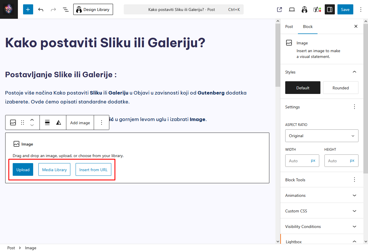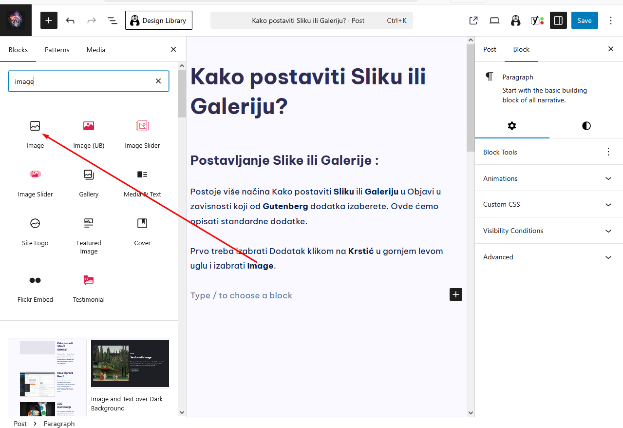 Postoje više načina Kako postaviti Sliku ili Galeriju u Objavi u zavisnosti koji od Gutenberg dodatka izaberete. Ovde ćemo opisati standardne dodatke.