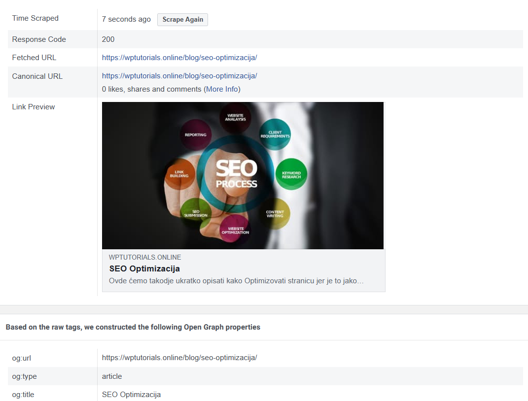 Zatim idemo na Stranicu Sharing debugger da bi proverili da li je sve spremno za deljenje.