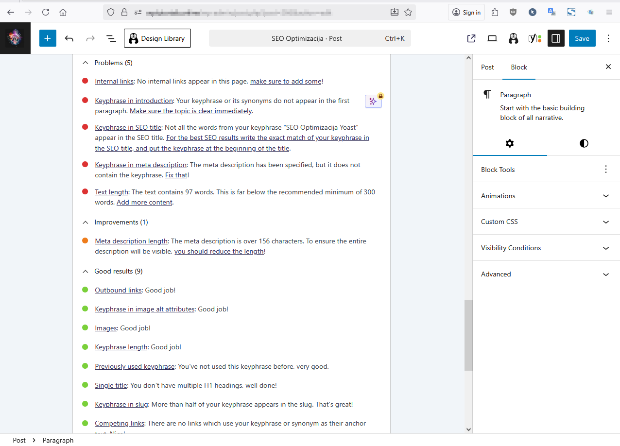 Na slici iznad vidimo da nije dobra SEO Optimizacija i probleme koje treba rešiti (obeleženo crvenim tačkama) i dobre postavke (obeleženo zelenim tačkama). Pošto smo poštovali Heading,Paragraf,ALT Slika i usaglasili Focus keyphrase sa Meta description,na Slici ispod zeleni smajli nam govore da je stranica Optimizovana. Medjutim,za savršenu Optimizaciju morate rešiti sve probleme obeležene crvenim tačkama a YOAST vam daje informacije šta treba popraviti.