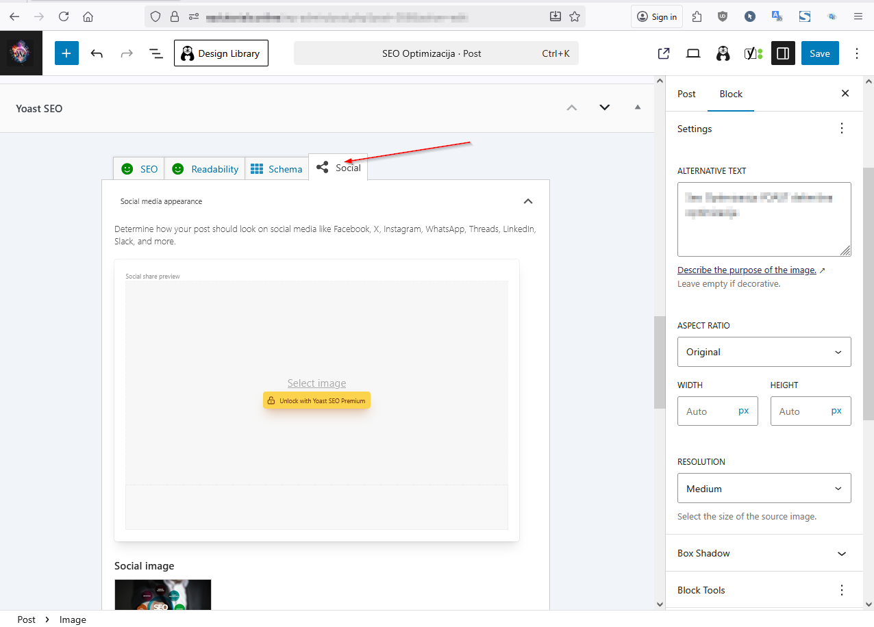Prvo klikni na Social u dnu Editora gde piše Yoast SEO.
