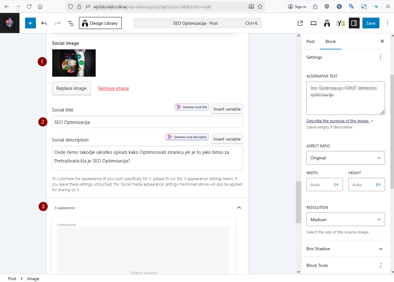 - 2 – Upiši Naslov (Social title) i Opis Stranice (Social description)..